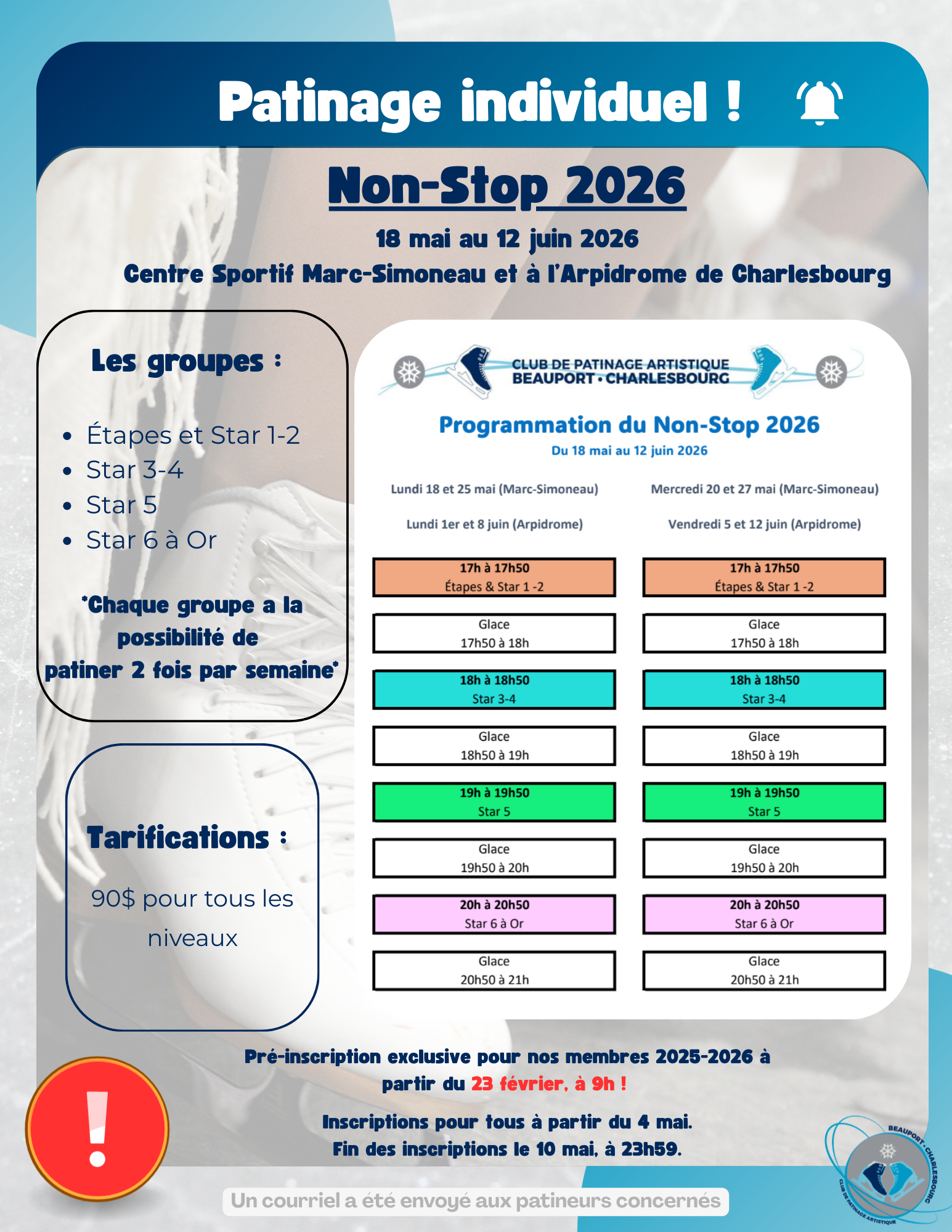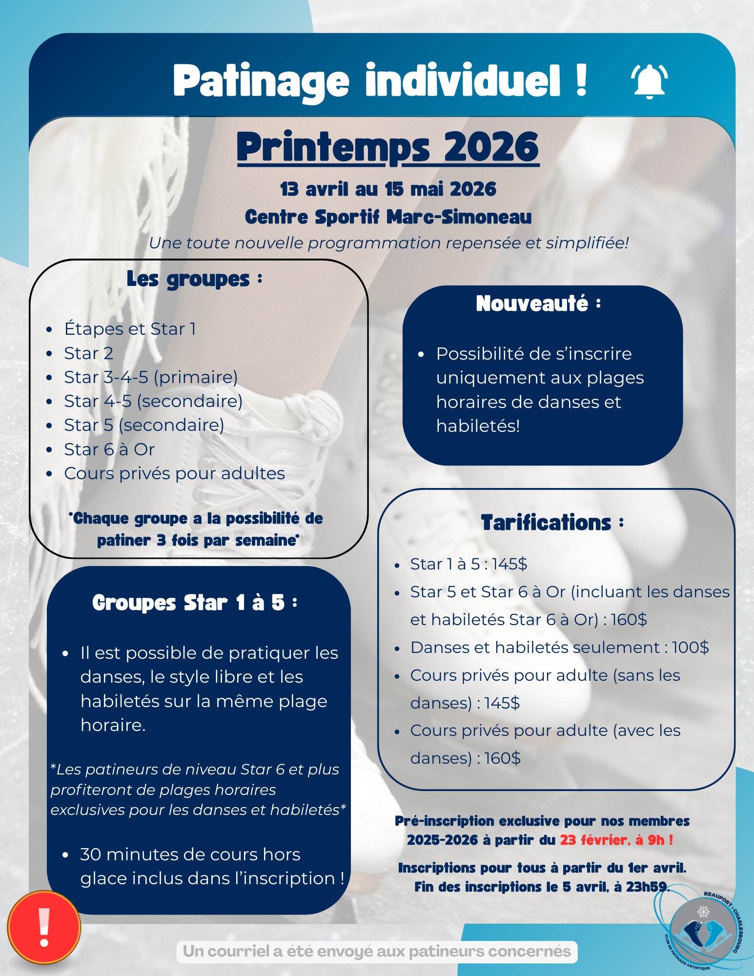 Le patinage individuel, ou cours privés ou semi-privés, est la suite du programme Patinage Plus. Le patinage individuel est un programme offert par le Club où les patineurs s'entraînent aux différentes disciplines du patinage artistique soit, le style libre, les danses, les habiletés de patinage, l'artistique et le patinage synchronisé. Unique au Canada, le patinage STAR enseigne les habiletés de patinage artistique en leçons individuelles ou en groupe, de manière progressive et logique et offre des prix et des récompenses conçus spécialement pour ce groupe de patineurs. Ces derniers ont la possibilité de vivre les évaluations de Patinage Canada par l'intermédiaire d'un système d'évaluations national uniformisé. Les évaluations sont progressives et s'étendent dans un continuum de 10 niveaux d'évaluations. Les évaluations de niveau Star 1 à 5 sont faites dans le cadre d'un entraînement régulier, par un entraîneur-évaluateur formé et certifié. Les évaluations Star 6 et plus sont faites dans un cadre plus formel par des juges-évaluateurs.