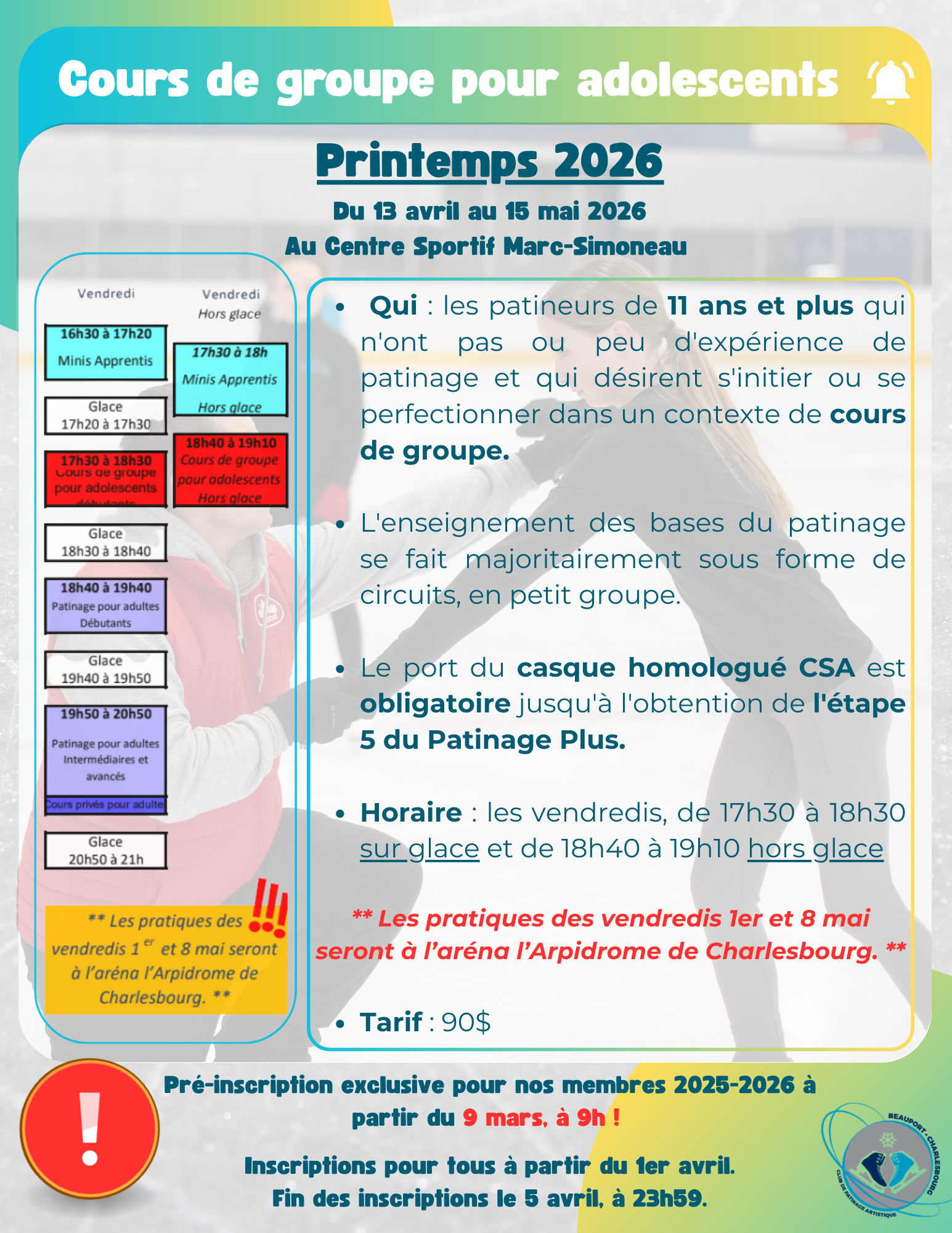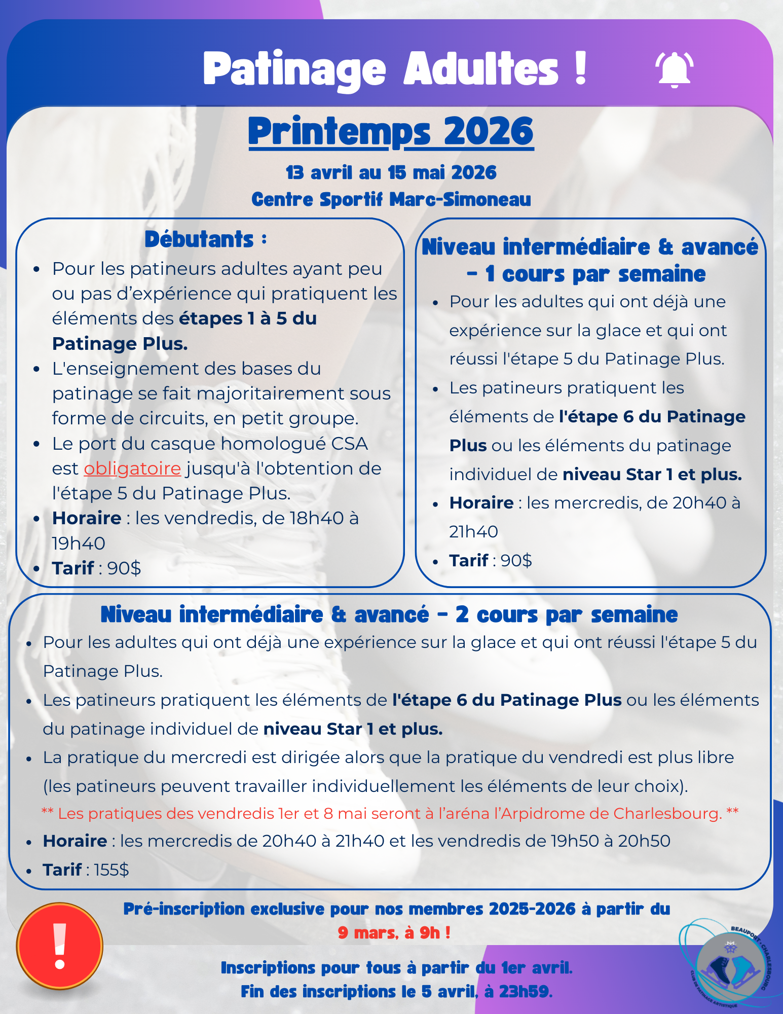 Aux débutants de tout âge, ainsi qu’à ceux qui souhaitent améliorer leurs habiletés de base, que ce soit pour le patinage artistique, le hockey, le patinage de vitesse ou simplement pour patiner par plaisir. L'âge minimum recommandé est de 3 ans.