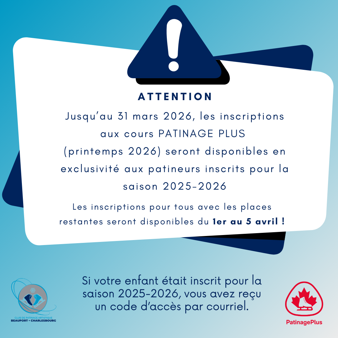 Les inscriptions pour les nouveaux patineurs seront disponibles à compter du 1er avril 2026.